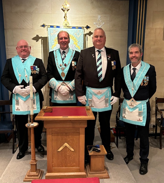 11th Oct 2024 - The Freemason hall in Stow on the Wold was rocking to the sound of Freemasons blasting out fun and fraternal friendship as we Installed our new Worshipful Master, Bro. Malcolm Wearing. The Prince of Wales Lodge was delighted to welcome the Provincial team with W. Bro Peter Trottman representing The Provincial Grand Master. We anticipated a great night, the officers and Brethren had rehearsed and worked hard to make the Installation meeting a success - and all that hard work paid off!! Thank you to all our visitors and it was great to have Sudeley Castle WM and IPM attend. This picture shows Jason and Ollie next to Malcolm and John.