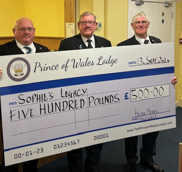 On the same evening our WM and Charity Steward presented a cheque to W. Bro Trevor Conduit to support the excellent work carried out by Sophie’s Legacy a charity that supports families who end up in hospital with their child - www.sophieslegacy.co.uk