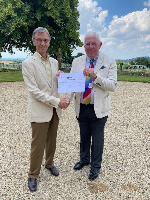 26th June 2024 - Our Charity Steward W. Bro Alan presents a £1000.00 cheque from the Brethren of the Prince of Wales Lodge to Michael Jones of the Honourable Company of Gloucestershire.